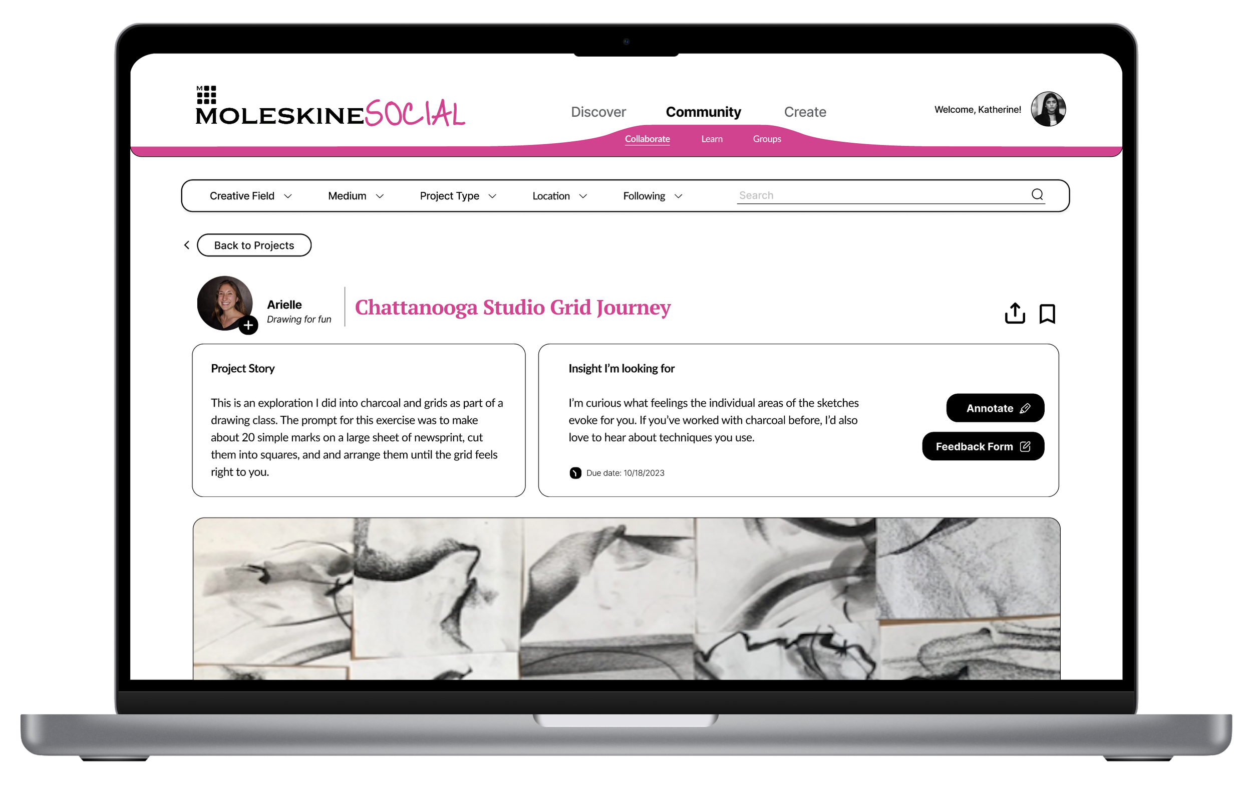 Katherine needs a way to share her work and receive meaningful feedback because feeling part of a community inspires her to complete her projects and grow as an artist.
